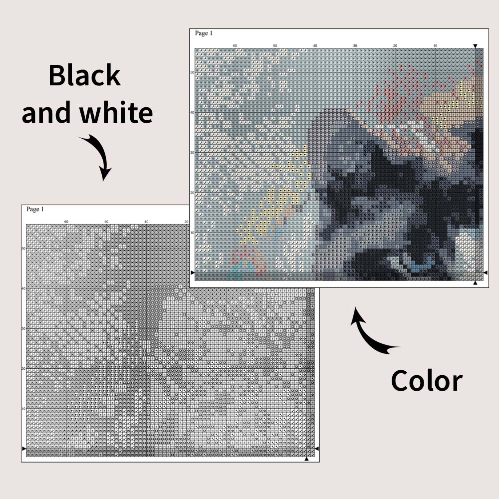 • A large color chart spread over several sheets with symbol key for design, number of the colors, color chart for a color printer